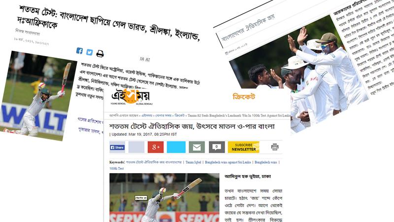 আনন্দবাজার পত্রিকা খেলার পাতায় প্রকাশিত ৬ কলামের খবরে শিরোনাম করেছে, ‘তামিমের ব্যাটে শততম টেস্টে বাংলার জয়গান’। সঙ্গে বাংলাদেশের ক্রিকেট দলের বিজয় উল্লাসের একটি ছবি।