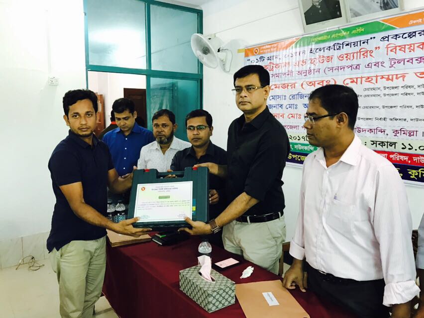 আজ কুমিল্লার দাউদকান্দি উপজেলায় ‘একটি গ্রাম, একজন ইলেকট্রিশিয়ান’ প্রকল্পের আওতায় ‘ইলেকট্রিক্যাল এন্ড হাউজ ওয়্যারিং’ বিষয়ক প্রশিক্ষন কোর্সের সমাপনী অনুষ্ঠানে সনদ বিতরণ করা হয়।