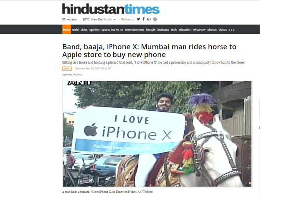 এতদিন রীতি ছিল সাদা ঘোড়ায় চড়ে ব্যান্ড বাজিয়ে বউ আনতে যায় বর। পাল্লিভাল নামের এই যুবকও তাই করেছেন। তবে বরযাত্রীর বেশে পাল্লিভাল বউ নয়, ফোন আনতে গিয়েছিলেন! ঘোড়ায় চড়া অবস্থায় তার হাতে ধরা ছিল একটি প্ল্যাকার্ড। তাতে লেখা, ‘আমি আইফোন এক্সকে ভালোবাসি’। তার ভালবাসাটা সত্যিই বটে।