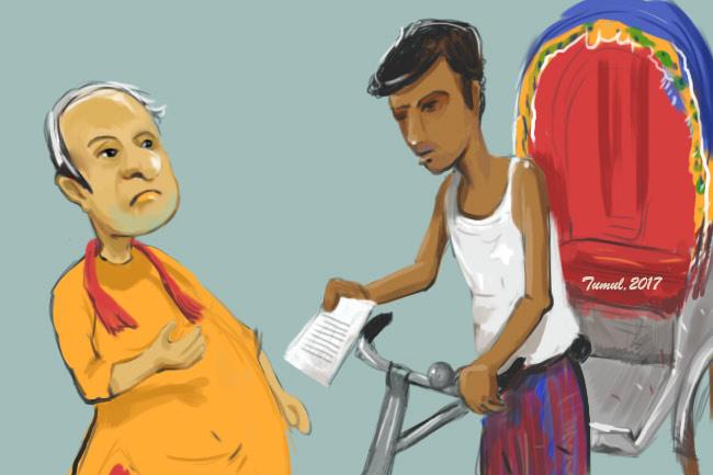 কন কী স্যার? আপনি সাবেক অর্থমন্ত্রী! তাহলে তো আরো ১০ শতাংশ ট্যাক্স বাড়ব। সাবেক সরকারের মন্ত্রী, এমপি, নেতাকর্মী, সরকারি কর্মচারীদের ওপর নতুন ট্যাক্স বসাইছে বর্তমান সরকার। এই বলে রিকশাচালক আগের বিল বাতিল করে নতুন করে প্রিন্ট আউট বের করে বিল ধরিয়ে দিলেন। এবার বিল এলো মোট ২৪০ টাকা।