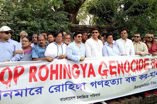 রোহিঙ্গা মুসলিমদের উপর মিয়ানমারের রাখাইন রাজ্যে সহিংসতা, নির্যাতন, হত্যা এবং তাদের বসতবাড়িতে অগ্নিসংযোগের প্রতিবাদে মানববন্ধন ও প্রতিবাদ সমাবেশ করেছে বাংলাদেশ চলচ্চিত্র পরিবার।