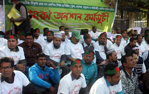 সোমবার জাতীয় প্রেসক্লাবের সামনে পাঁচদিনের অবস্থান কর্মসূচির পর টানা তৃতীয় দিনের মতো আমরণ অনশন কর্মসূচি পালন করছেন শিক্ষক-কর্মচারীরা।