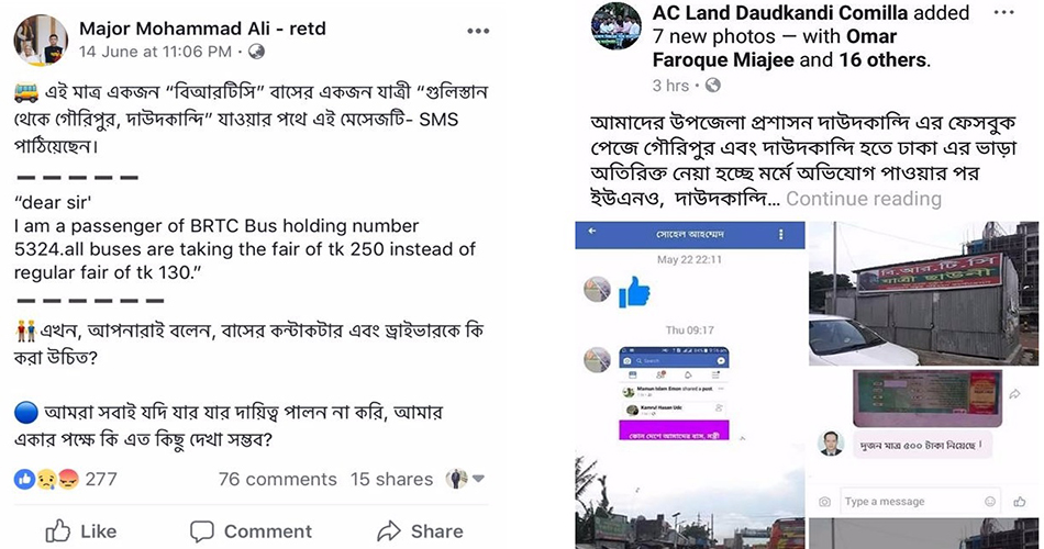 সূত্র জানায়, দাউদকান্দি উপজেলা পরিষদের চেয়ারম্যান মেজর মোহাম্মদ আলী (অব.) সুমন ফেসবুক ম্যাসেজের মাধ্যমে বিআরটিসি বাসের জনৈক যাত্রীর কাছ থেকে গৌরিপুর এবং দাউদকান্দি হতে ঢাকা যাওয়ার ভাড়া বেশি নিয়ে যাত্রি হয়রানি অভিযোগ পেয়ে বিআরটিসি’র বিরুদ্ধে প্রয়োজনীয় ব্যবস্থা গ্রহণের নির্দেশ দেন।