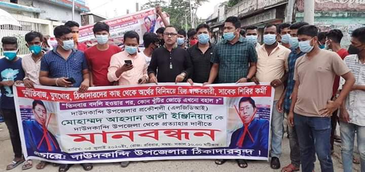 কুমিল্লার দাউদকান্দি উপজেলার প্রকৌশলী ইঞ্জিনিয়ার আহসান আলীর বিরুদ্ধে চরম দুর্নীতি ও ঘুষের অভিযোগ উঠেছে। এর প্রতিবাদে, তাকে অপসারণের দাবিতে স্থানীয় ঠিকাদাররা মানববন্ধন ও স্মারকলিপি প্রদান করেছেন।