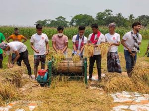 ছবি: দৌলতপুর ইউনিয়ন ছাত্রলীগের নেতাকর্মীরা পাকা ধান কেটে ,জমিতে ধান মাড়াই করে দিচ্ছেন।
