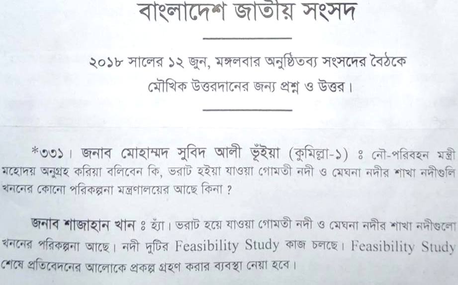 এ সময় মন্ত্রী বলেন, ভরাট হয়ে যাওয়া কুমিল্লার গোমতী ও মেঘনা নদীর শাখা নদীগুলো খননের পরিকল্পনা আছে। নদী দুটির Feasibility Study কাজ চলছে। Feasibility Study শেষে প্রতিবেদনের আলোকে প্রকল্প গ্রহণ করার ব্যবস্থা নেয়া হবে।