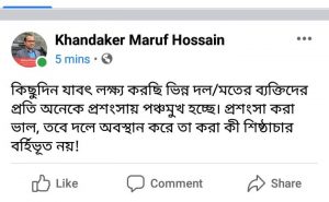 প্রতিক্রিয়া সামাজিক যোগাযোগ মাধ্যমে খন্দকার মারুফ হোসেন লেখেন, “কিছুদিন যাবৎ লক্ষ্য করছি ভিন্ন দল/ব্যক্তিদের প্রতি অনেকে প্রশংসায় পঞ্চমুখ হচ্ছে। প্রশংসা করা ভালো, তবে দলে অবস্থান করে তা করা কী শিষ্টাচার বহির্ভূত নয়!”