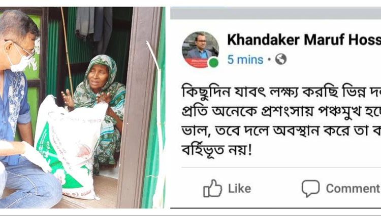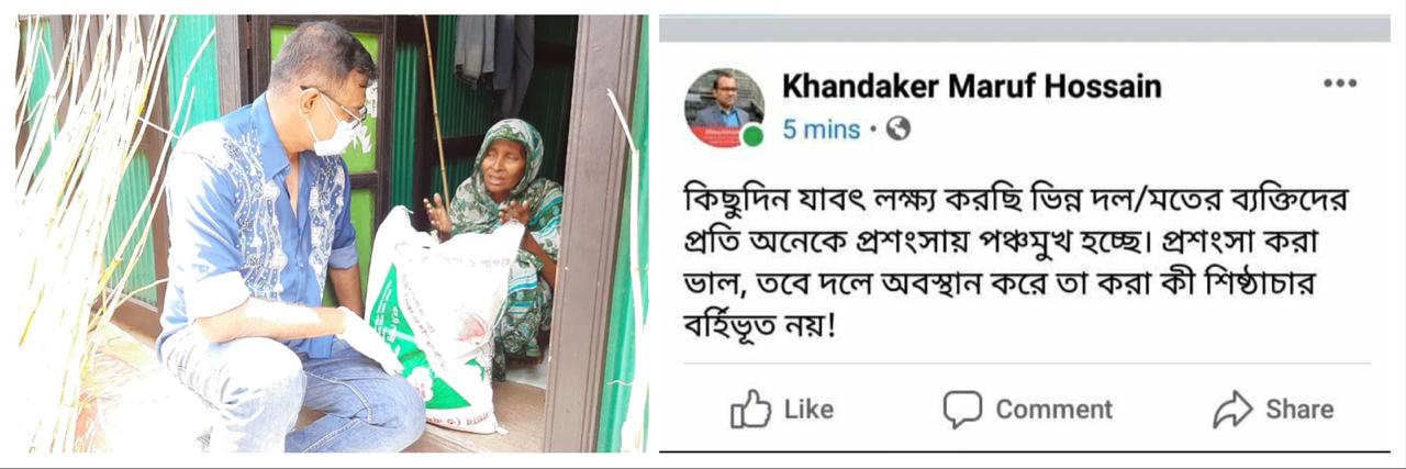 মারুফ হোসেনের ওই প্রতিক্রিয়াটি নিজের ভেরিফাইড ফেসবুক পেজে শেয়ার দিয়ে- দাউদকান্দি উপজেলা পরিষদ চেয়ারম্যান মোহাম্মদ আলী লেখেন, “আমরা কে কোন রাজনৈতিক দল করি, করোনা মহামারীর সময় এটা বড় নয়। প্রথমে হচ্ছে আমরা মানুষ। আমরা আল্লাহর বান্দা। আল্লাহ মানুষ সৃষ্টি করেছেন, মানুষের সেবা করার জন্য। কোন নির্দিষ্ট ধর্ম /বর্ণ/গোত্র বা নির্দিষ্ট রাজনৈতিক মতাদর্শের ব্যক্তিদের অথবা সমর্থকদের সেবা করার জন্য নয়।