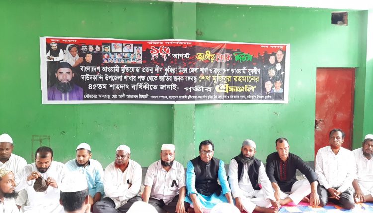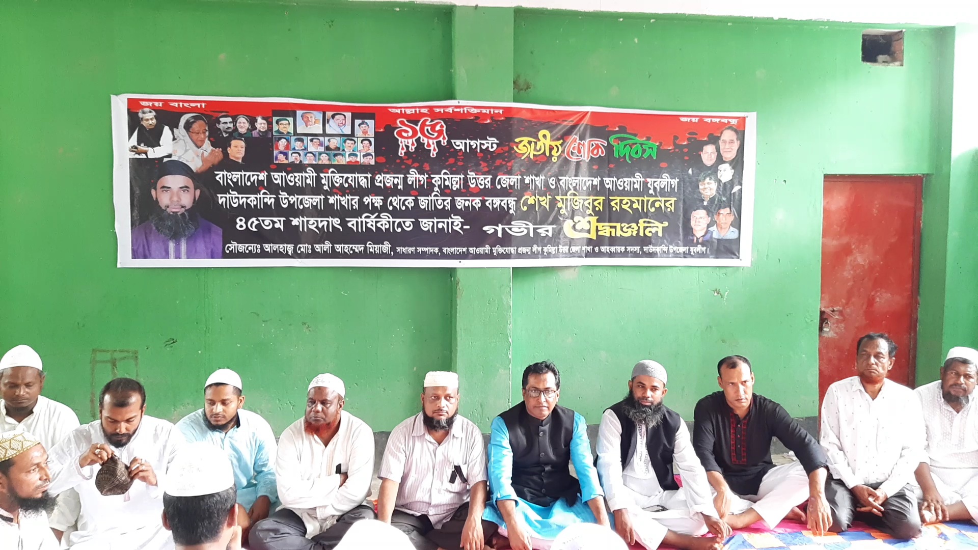 (১৫ আগস্ট) ইলিয়টগঞ্জ (দ:) ইউনিয়নের বাশরা গ্রামে, কুমিল্লা (উ:) জেলা আওয়ামী মুক্তিযোদ্ধা প্রজন্ম লীগের সাধারণ সম্পাদক আলী আহমদ মিয়াজীর উদ্যোগ ও সহোযোগীতায় , দাউদকান্দি উপজেলা যুবলীগের যুগ্ম আহ্বায়ক মেহেদী হাসান সুমনের উপস্থিতিতে অত্যন্ত ভাবগাম্ভীর্য ও যথাযথ মর্যাদায়, জাতীয় শোক দিবস ও বঙ্গবন্ধুর ৪৫ তম শাহাদাত বার্ষিকীতে আলোচনা সভা, দোয়া-মোনাজাত ও খাবার বিতরণ করা হয়।