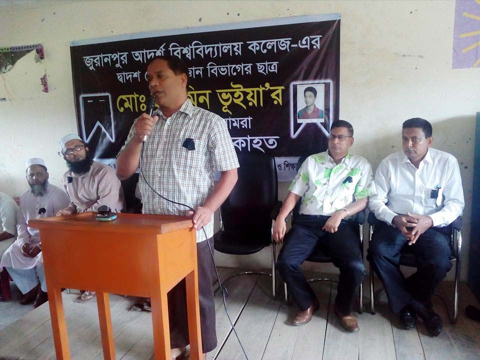 জুরানপুর আদর্শ বিশ্ববিদ্যালয় কলেজের অধ্যক্ষ শরিফুল ইসলামের সভাপতিত্বে শোকসভায় কান্নাবিজড়িত কন্ঠে অশ্রুসজল অবস্থায় বক্তব্য রাখেন উপাধ্যক্ষ শাহ আলম ভূইয়া, মনোবিজ্ঞান বিভাগের সহকারি অধ্যাপক জহির উদ্দিন আহমেদ ও ইংরেজি বিভাগের সহকারি অধ্যাপক এবং বিভাগীয় প্রধান মোঃ কামাল হোসেন। সভা শেষে কলেজ ছাত্র ইয়ামিনের জন্য দোয়া ও মোনাজাত পরিচালনা করেন কলেজের ইসলামি শিক্ষা ও আরবী বিভাগের প্রধান মাওলানা আব্দুল হামিদ।