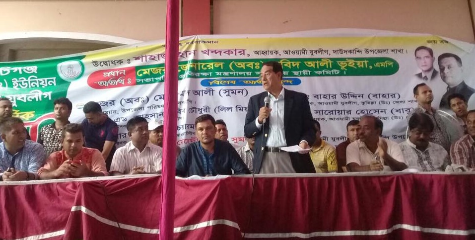 দাউদকান্দিতে যুবলীগের সম্মেলনে প্রতিরক্ষা মন্ত্রণালয় সংক্রান্ত সংসদীয় কমিটির সভাপতি মেজর জেনারেল (অবঃ)মো:সুবিদ আলী ভূইয়াকে লক্ষ্য গুলি। গুলিটি লক্ষ্যহীন হয়ে ইলিয়টগঞ্জ দক্ষিন ইউনিয়ন যুবলীগের সভাপতি মাহবুবুল হক সবুজ গুলিবিদ্ধ হয়। গুলিবিদ্ধ যুবলীগ নেতা সবুজকে গৌরীপুর হাসপাতালে প্রাথমিক চিকিৎসা দেয়ার পর তাকে ঢাকায় প্রেরণ করা হয়। ঘটনাটি ঘটেছে বৃহস্পতিবার বিকালে উপজেলার রায়পুর উচ্চ বিদ্যালয় মাঠে।