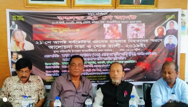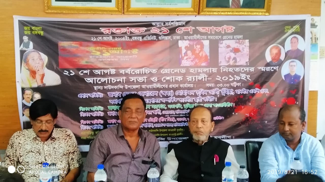 ২০০৪ সালের ২১ আগস্ট ইতিহাসের নিকৃষ্টতম ও বর্বরোচিত এই হামলায় নিহত সকল শহীদদের স্মরণে দাউদকান্দি উপজেলার বিভিন্ন স্থানে দিনব্যাপী এ কর্মসূচি পালিত হয়। দুপুরে দাউদকান্দি উপজেলা আওয়ামী লীগের অফিসে ২১ আগস্ট শহীদদের স্মরণে এক শোকসভা ও দোয়া মাহফিল অনুষ্ঠিত হয়। এতে প্রধান অতিথি ছিলেন কুমিল্লা-১ (দাউদকান্দি ও মেঘনা) আসনের টানা তৃতীয়বারের মতো নির্বাচিত সংসদ সদস্য এবং প্রতিরক্ষা মন্ত্রণালয় সম্পর্কিত সংসদীয় স্থায়ী কমিটির সভাপতি মেজর জেনারেল (অব.) সুবিদ আলী ভূঁইয়া। বিশেষ অতিথি ছিলেন কুমিল্লা উত্তর জেলা আওয়ামী লীগের সভাপতি আব্দুল আউয়াল সরকার, দাউদকান্দি উপজেলা আওয়ামী লীগের সভাপতি আহসান হাবীব চৌধুরী লীল মিয়া। সভাপতিত্ব করেন উপজেলা যুবলীগের আহ্বায়ক আনোয়ার হোসেন।