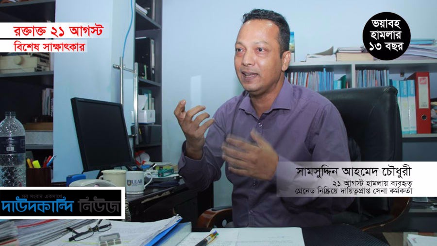 ক্যাপ্টেন সামসুদ্দিন আহমেদ চৌধুরী (সামস), ২০০৪ সালে সেনাবাহিনীর ১৪ ব্রিগেডের অধীনে ৫৭ ইঞ্জিনিয়ারিং কোম্পানির নেতৃত্বে ছিলেন। সেসময় দেশের বিভিন্ন স্থানে উদ্ধার হওয়া বিস্ফোরক নিস্ক্রিয় করার দায়িত্ব ছিল তার কোম্পানির ওপর। পরে ২০১০ সালে আওয়ামী লীগ নেতৃত্বাধীন সরকার তাকে অবসরের দিন ঠিক রেখে মেজর পদে পদোন্নতি দেয়। একুশ আগস্ট গ্রেনেড হামলার কয়েক মাসের মধ্যে অকালীন বাধ্যতামূলক অবসরে (প্রি-ম্যাচিউর কম্পোলসারি রিটায়ারমেন্ট) যাওয়া এই সেনা কর্মকর্তা সম্প্রতি প্রিয়.কম-এর কাছে বলেছেন সেসব দিনের অভিজ্ঞতার কথা। বর্তমানে জেনেটিক লিমিটেড নামে একটি নির্মাণ প্রতিষ্ঠানের নির্বাহী পরিচালক হিসেবে কর্মরত সাবেক এই সেনা কর্মকর্তা এক দুপুরে নিজের অফিসে বসে কথার ঝাঁপি খুলেছিলেন। জানিয়েছেন কীভাবে ঊর্ধ্বতনের নির্দেশে সেদিন ঘটনাস্থলে পাওয়া হামলায় ব্যবহৃত তাজা গ্রেনেডগুলো ধ্বংস করা হয়েছিল।
