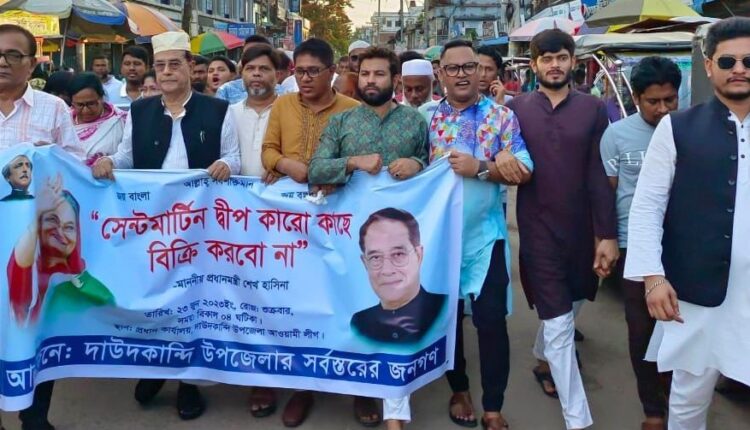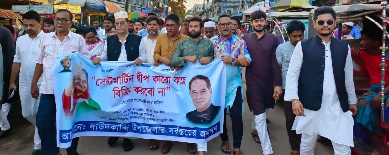 শুক্রবার (২৩ জুন ২০২৩) বিকেলে দাউদকান্দি উপজেলা আওয়ামী লীগ ও সহযোগী সংগঠনের আয়োজিত দলের প্রতিষ্ঠাবার্ষিকী অনুষ্ঠান শেষে ‘সেন্টমার্টিন দ্বীপ বিক্রি করবো না’ প্রধানমন্ত্রী শেখ হাসিনার এমন বক্তব্যকে স্বাগত জানিয়ে দাউদকান্দিতে মিছিল পূর্বক সমাবেশে প্রধান অতিথির বক্তব্যে  একথা বলেন।