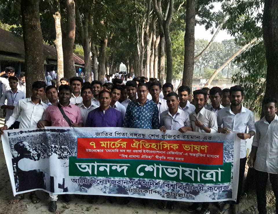 জাতির পিতা বঙ্গবন্ধু শেখ মুজিবর রহমান এর ৭ই মার্চের ঐতিহাসিক ভাষণ ইউনেস্কোর “মেমোরি অব দ্যা ওয়ার্ল্ড ইন্টারন্যাশনাল রেজিস্ট্রার”-এ অন্তর্ভূক্তির মাধ্যমে “বিশ্বপ্রামাণ্য ঐতিহ্য” হিসেবে স্বীকৃতি লাভ করায়, কুমিল্লার দাউদকান্দির জুরানপুর আদর্শ বিশ্ববিদ্যালয় কলেজে আনন্দ শোভাযাত্রাসহ নানা কর্মসূচি উদযাপিত হয়েছে।
